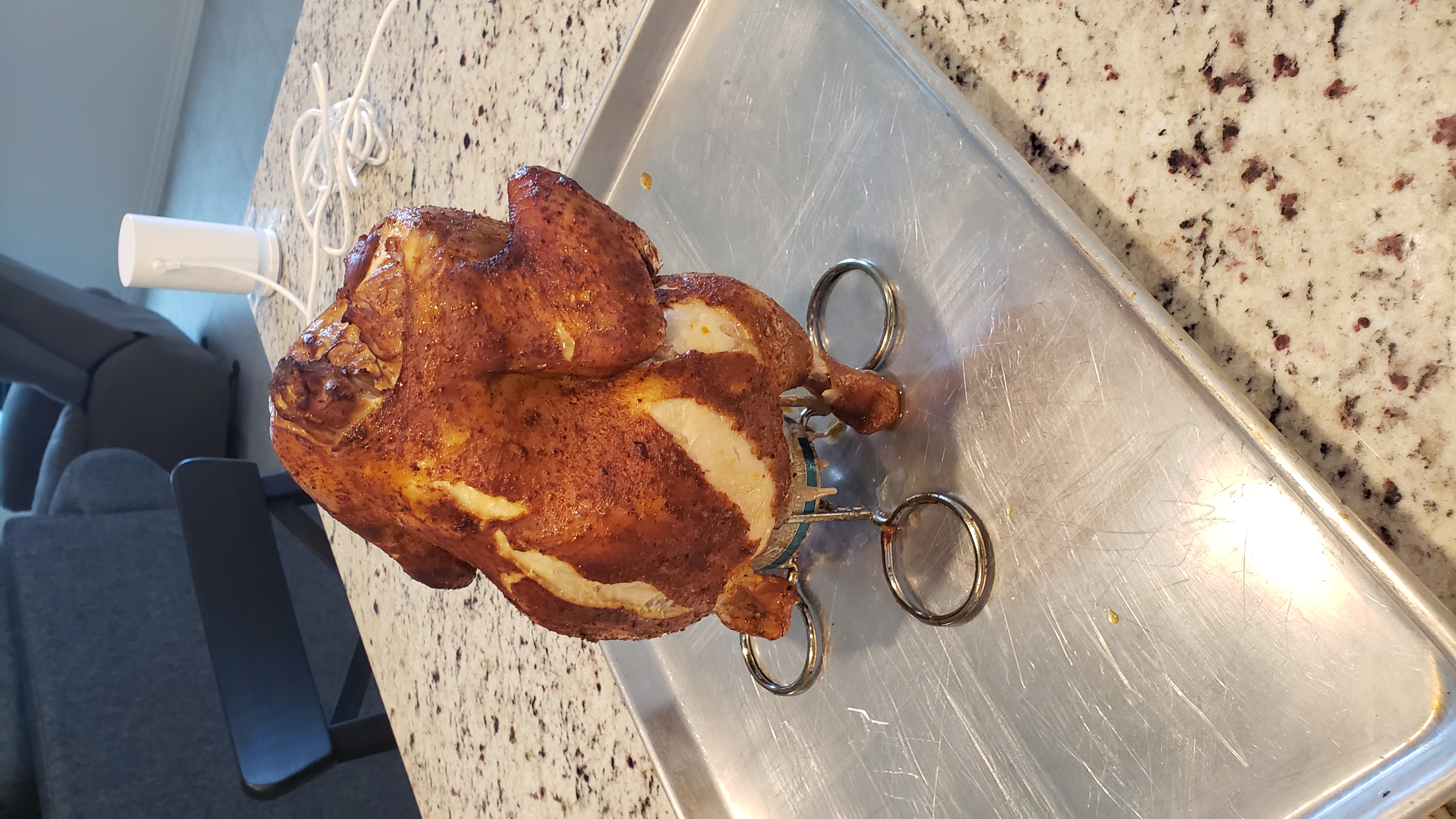 Let sit in fridge for a few hours after rinsing brine off. Rubbed with olive oil and then the chicken rub