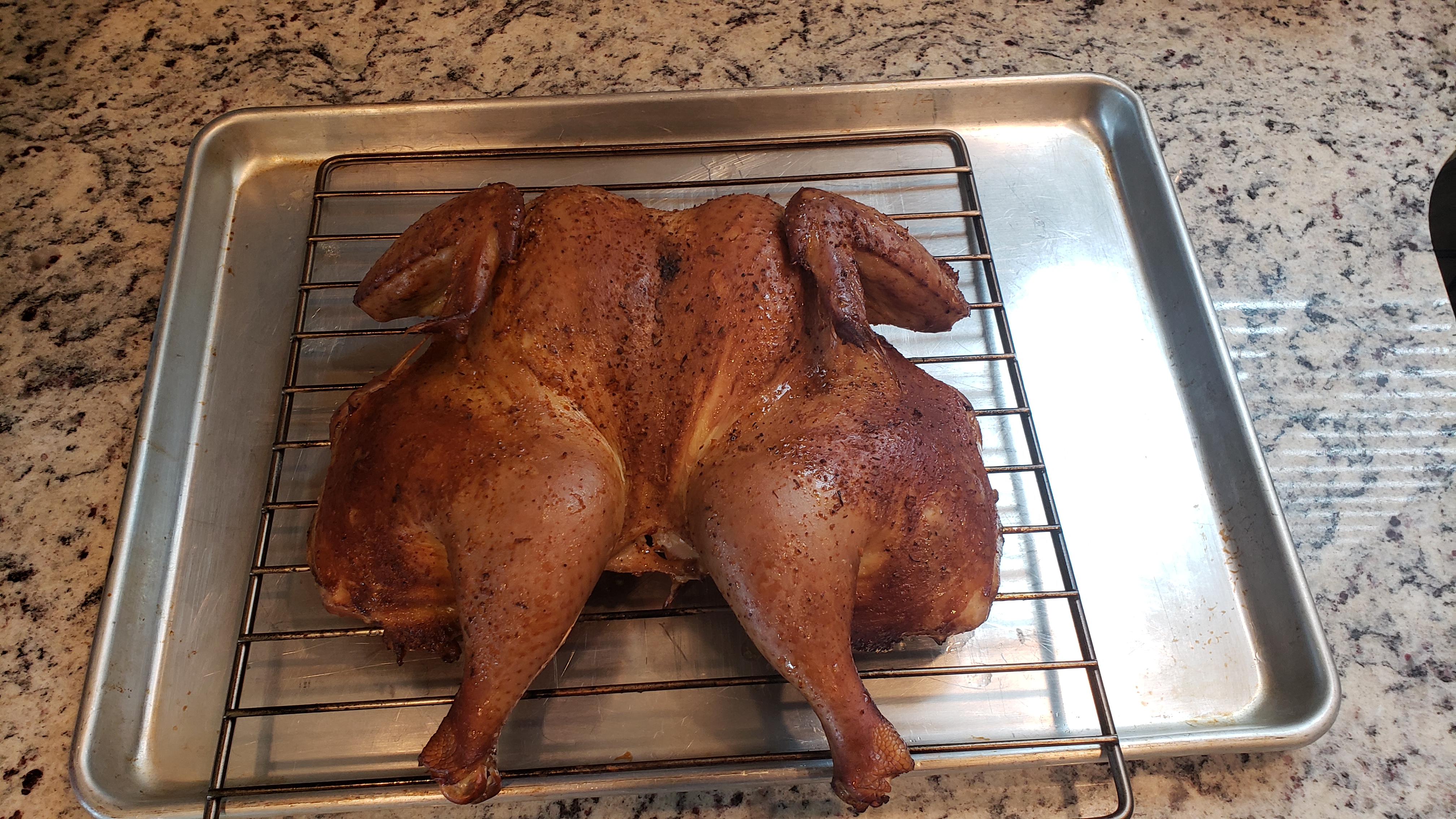 Let sit in fridge for a few hours after rinsing brine off. Rubbed with olive oil and then the chicken rub